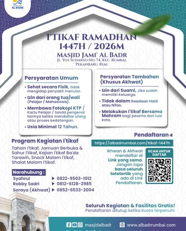 Segala puji bagi Allah ๏ทป yang masih mempertemukan kita dengan bulan suci Ramadhan 1447 H. Dengan penuh rasa syukur, kami mengumumkan bahwa Pendaftaran Iโtikaf Ramadhan 1447 H di Masjid Jami' Al Badr telah resmi dibuka.