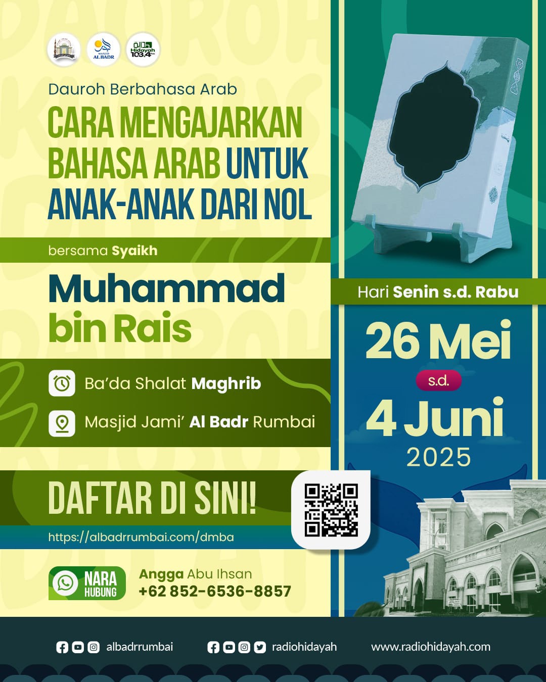 Mengajarkan bahasa Arab kepada anak-anak sejak dini bukan hanya tentang mengenalkan mereka pada kosakata dan tata bahasa, tetapi juga membuka jalan agar mereka bisa lebih dekat dengan Al-Qur'an dan memahami agama Islam dengan lebih baik. Maka dari itu, kami mengundang para orang tua, pendidik, dan siapa saja yang memiliki perhatian terhadap pendidikan Islam anak-anak untuk mengikuti Dauroh Berbahasa Arab yang insyaAllah akan membahas "Cara Mengajarkan Bahasa Arab untuk Anak-Anak dari Nol".
