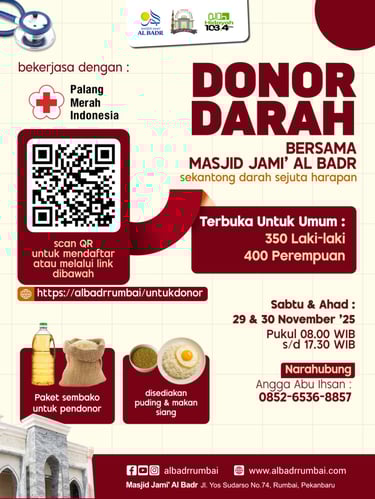 Masjid Jamiโ Abu Dardaโ, Masjid Jami' Al Badr, SIT Al Bayyinah, Ma'had Abu Darda' Ash Shohaby, Ma'had Tahfidz Al Misykaah bekerja sama dengan PMI Pekanbaru mengundang seluruh jamaah dan masyarakat untuk berpartisipasi dalam kegiatan Donor Darah.