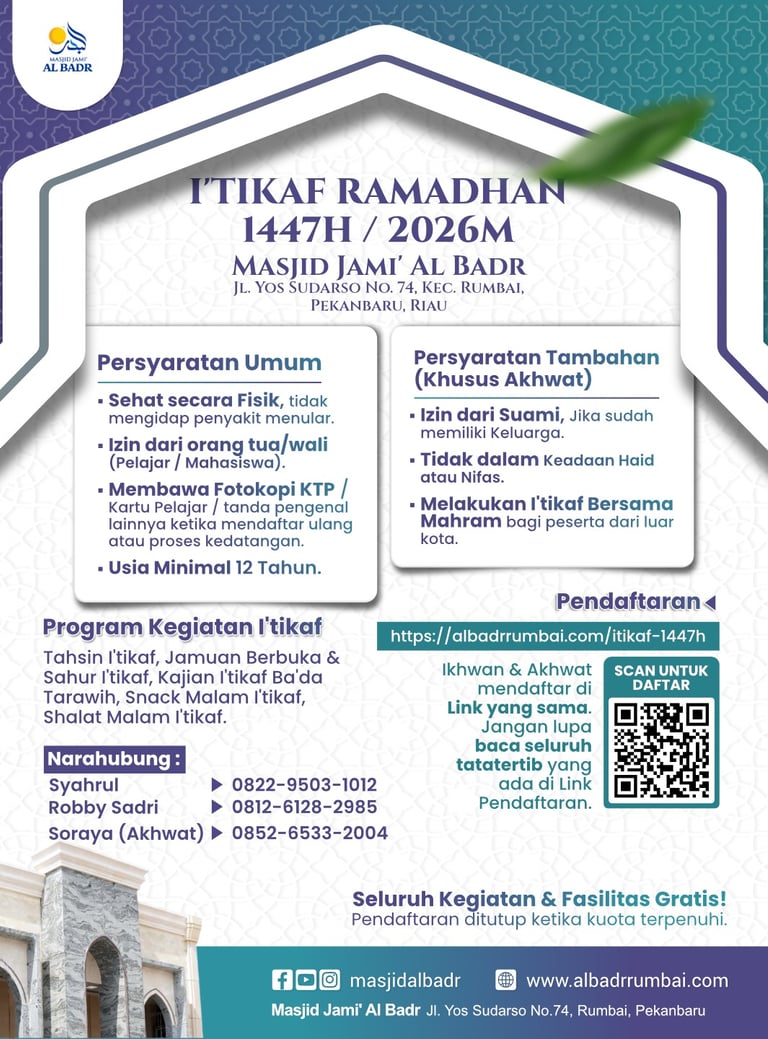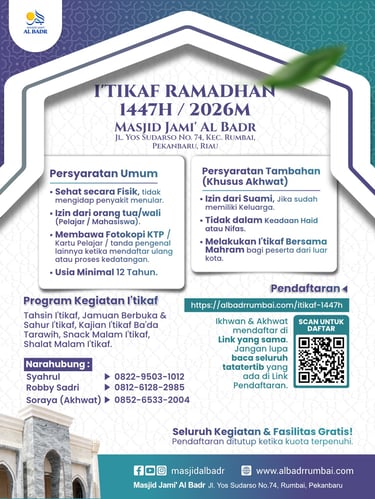 Diharapkan peserta I'tikaf dapat hadir di Masjid Jami' Al Badr pada ba'da shalat Ashar berjamaah, 20 Ramadhan 1447H.
