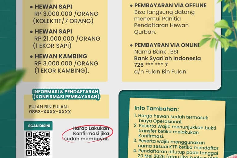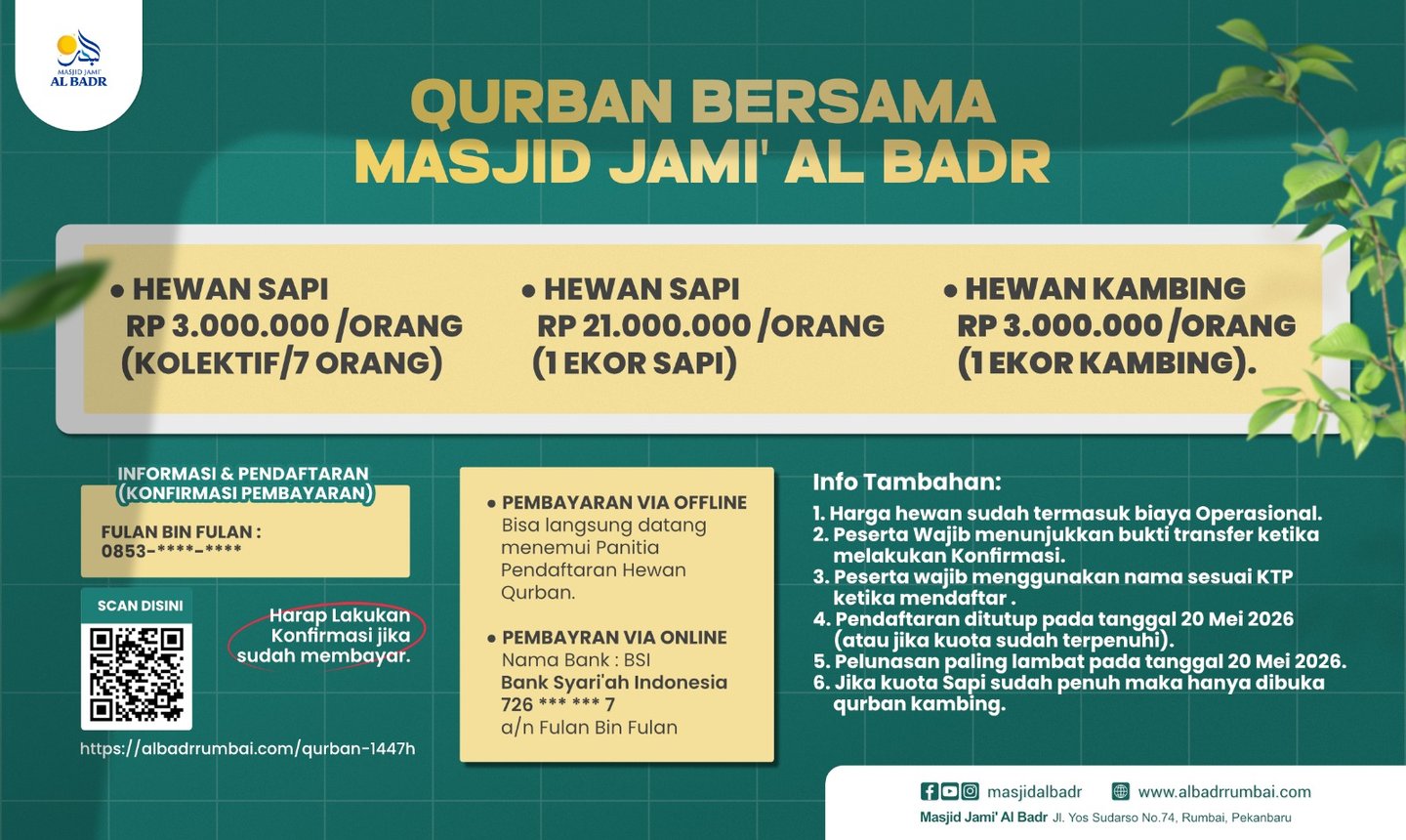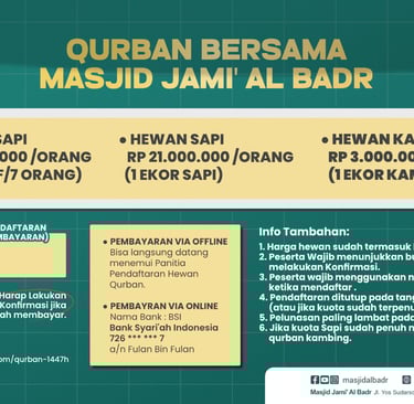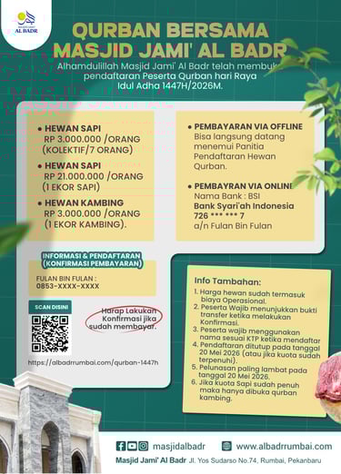 Alhamdulillah Masjid Jami' Al Badr telah membuka pendaftaran Peserta Qurban hari Raya Idul Adha 1447H/2026M, pendaftaran ini terbuka untuk seluruh Kaum Muslimin.