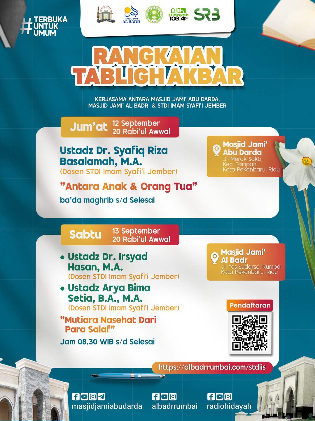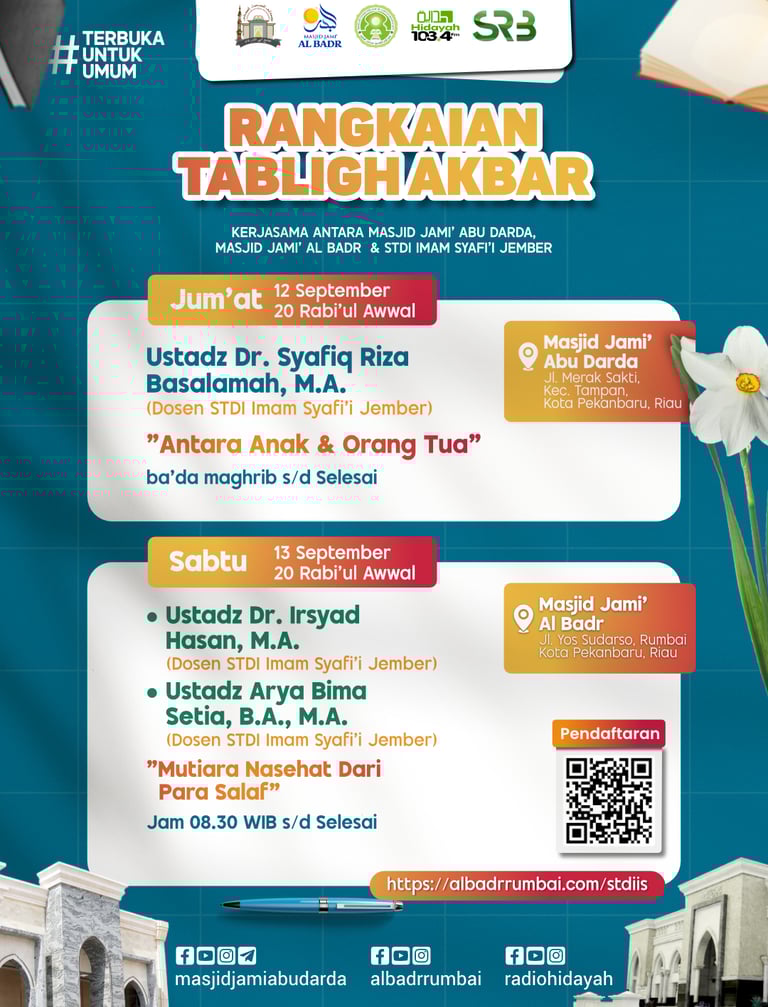 Alhamdulillah, dengan izin Allah Subhanahu wa Taโala, Masjid Jamiโ Al Badr dan Masjid Jami' Abu Darda' berkerja sama dengan STDI Imam Syafiโi Jember mengajak kaum muslimin dan muslimat untuk menghadiri majelis ilmu yang penuh manfaat ini: